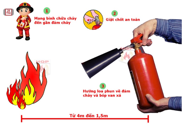 - Bóp (vặn) van để khí CO2 trong bình chữa cháy tự phun ra dập đám cháy. Giữ vòi phun di chuyển qua các khu vực của đám cháy để dập hoàn toàn đám cháy.